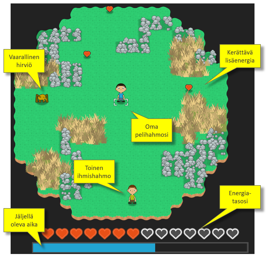 Sinun pelihahmosi aloittaa ruudun keskellä. Sinun tulisi pitää hänet hengissä koko kentän keston ajan (noin 10-20 sekuntia) ja kerätä niin paljon energiaa kuin mahdollista. Kentän jäljellä oleva aika näkyy sinisestä palkista.